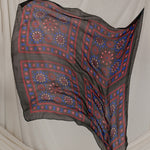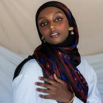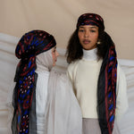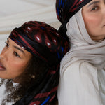 Crafted by Artisans in Aleppo, each Habari begins with hand made color blocks that were lovingly carved by artisans to create this print on 100% luxurious Habari silk. Using a lime resist technique, the intricate design is printed in traditional Aleppian colors that embodies bold and timeless colorway. Traditionally worn by Kurdish women in Syria, this style reflects a heritage of beauty and resilience. Classic black with subtle pops of navy and red makes this one of a kind hijab one you can dress up or down.